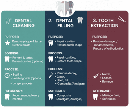 Dental filling can repair cavities and restore minor tooth problems. It can be done by white composite or amalgam. If dental restoration is not possible, it may require tooth extraction.
